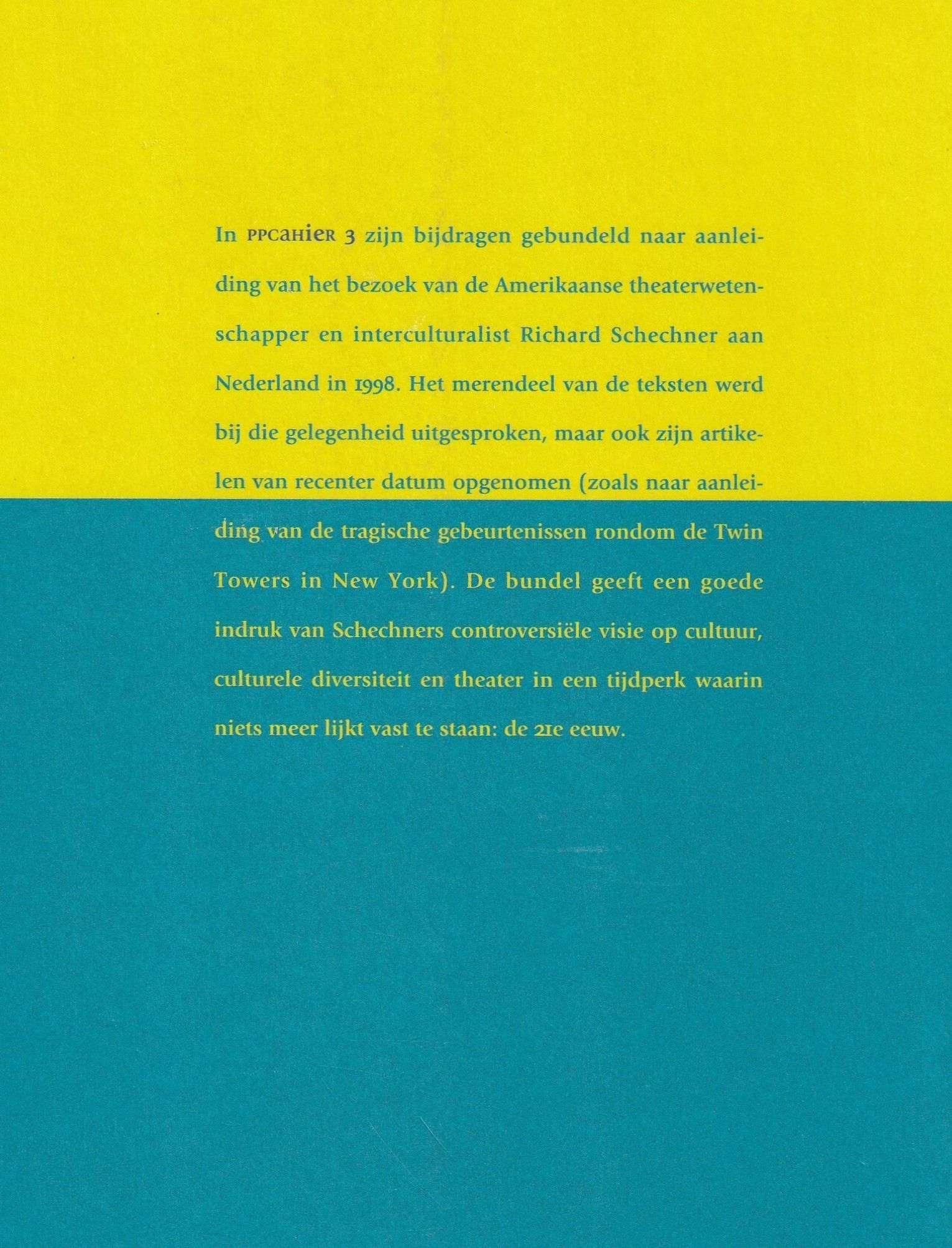 Richard Schechner (Newark 1934) stond lange tijd bekend als een van de meest vooraanstaande denkers over culturele beïnvloeding in het moderne theater. Hij publiceerde talloze artikelen en boeken over de theaterpraktijk met een accent op interculturalisme, theaterantropologie en rituelen. Daarnaast experimenteerde hij met theatrale elementen uit diverse culturen en creëerde onder meer een Kersentuin in het Hindi en Aischylos' Oresteia in de stijl van de peking opera. Tussen 1967 en 1980 was hij artistiek leider van The Performance Group, voorloper van de Wooster Group (New York). Die laatste was ook herhaaldelijk in Nederland te zien. Schechner was lange tijd verbonden als hoogleraar Performance Studies aan de Tisch School of the Arts, New York.
